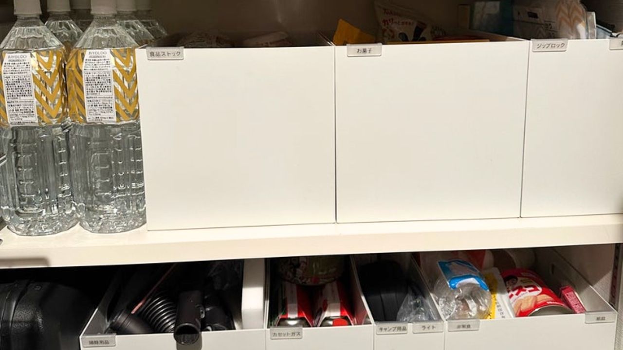 もしパントリーや食品庫があるなら、IKEAのワゴンや無印良品のファイルボックスなどを活用して、ジャンルごとに定位置を決めましょう。「レトルトコーナー」「缶詰コーナー」などとラベリングしておくと、家族みんながどこに何があるか把握できて便利です。中身が見える透明なボックスなら、在庫の確認も一目瞭然です。