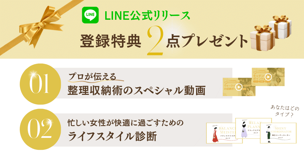 こちらのラインでは3日~7日に1回の頻度でお届けする「みるみる身に付く整理収納レッスン」の配信やお客様事例とご感想、おすすめ収納グッズ、整理収納丸わかりクイズなどを気軽にお楽しみいただけるコンテンツ満載となっております。
